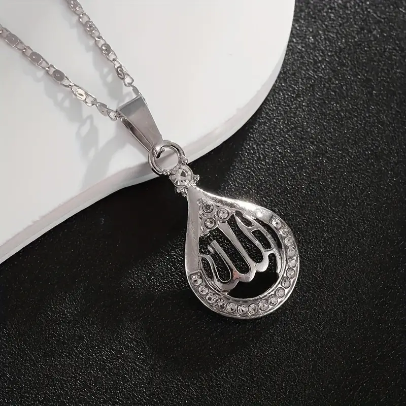 Silver necklace with Allah’s name in a beautiful design, accented with rhinestones.