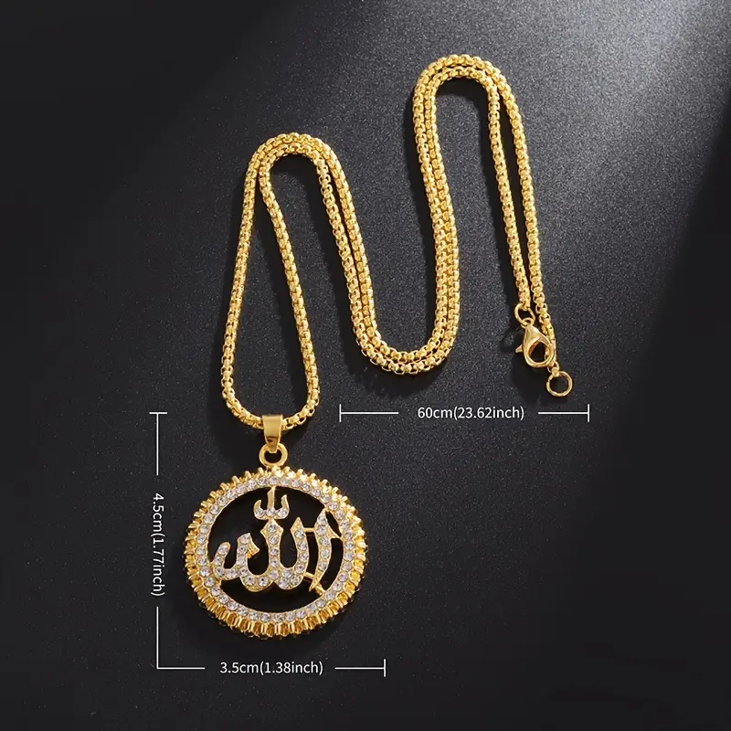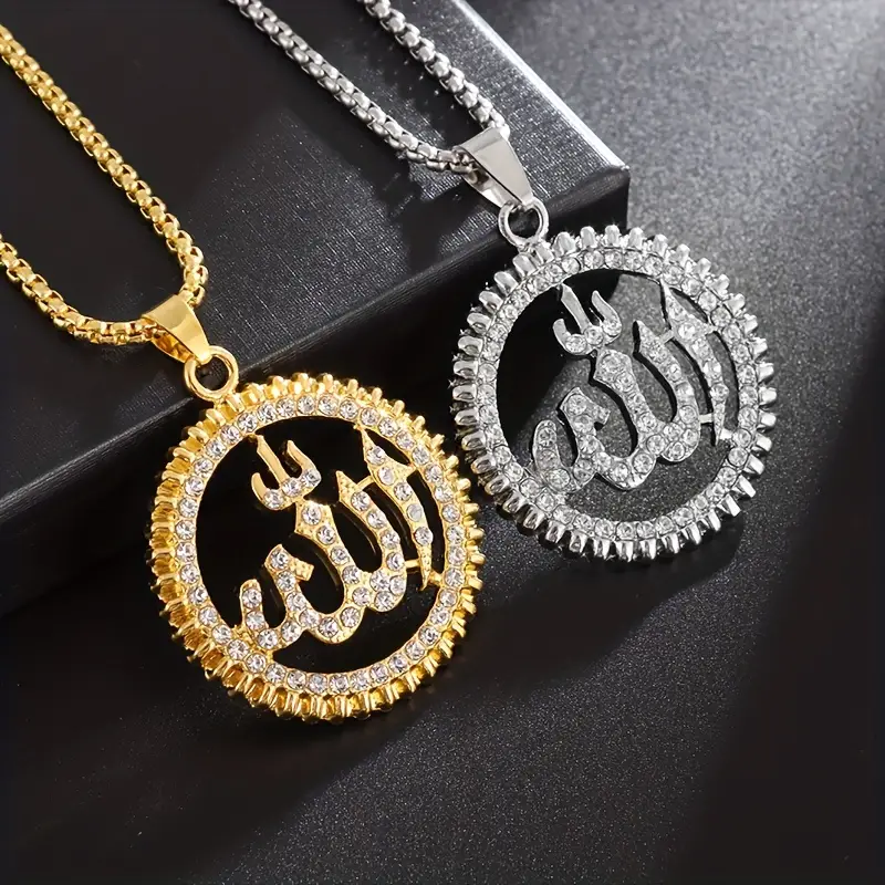This rounded shape Zirconia Allah pendant in silver and golden colors is a timeless piece of Islamic jewelry. The Allah name necklace is adorned with sparkling zircon stones, adding elegance and faith. Perfect as a gift for men and gift for women, this necklace makes a meaningful statement. Ideal for both daily wear and special occasions, it combines spirituality and style. The stunning Allah pendant is a perfect addition to any collection of Islamic gifts.